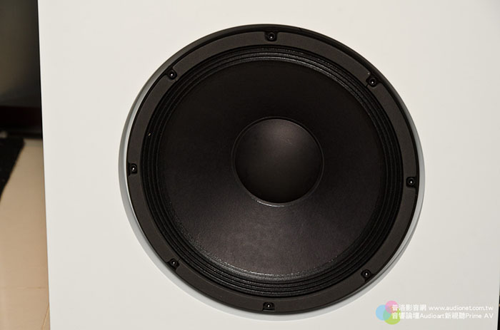 这颗低音原本有一个网罩,可是代理商研究老半天都拆不下来,原来它没有用传统网罩的固定方式,经由Holger Fromme讲解才知道从网罩中央压下去就能取下来.一般人哪敢乱压网罩,由此「弹性网罩」也能看出德国人设计产品观点的独到之处.